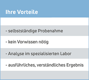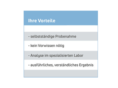 Bitte beachten Sie: Die Analysen sind für die Eigenkontrolle konzipiert. Eine gerichtliche oder behördliche Verwendbarkeit der Analyseergebnisse kann nicht garantiert werden, da u.a. die Probennahme durch den Kunden selbst erfolgt. Für diese Untersuchungen ist eine Probenahme durch einen geschulten, unabhängigen Probenehmer erforderlich. Benötigen Sie einen Probenehmer? Gerne helfen wir Ihnen weiter.