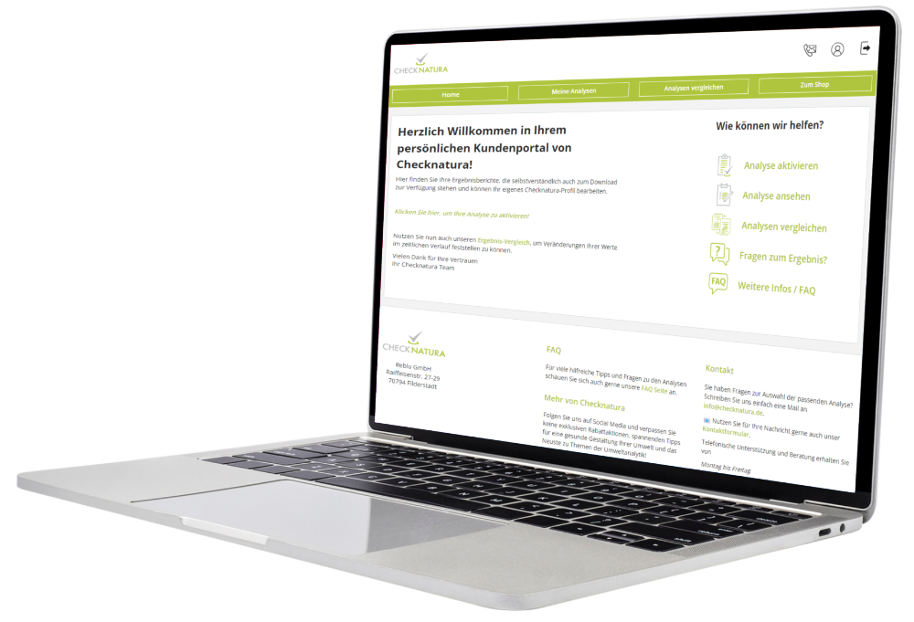 Sie erhalten Ihren Ergebnisbericht in Ihrem geschützten Kundenbereich MyChecknatura. Denn wir sind überzeugt: Ihre Umweltgesundheit und Ihre personenbezogenen Daten sind vertrauliche Angelegenheiten, die ausschließlich Sie betreffen.